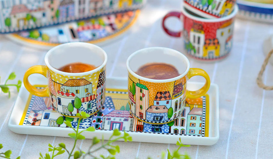За сутрешния ритуал: изящни чаши за кафе и чай, чайници и захарници с уникални мотиви.